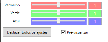 A função Tons ira liberar um controle para o ajuste da tonalidade das cores RGB(Vermelho, Verde e Azul), com a opção de desfazer os ajustes feitos e uma checkbox de pré-visualização .